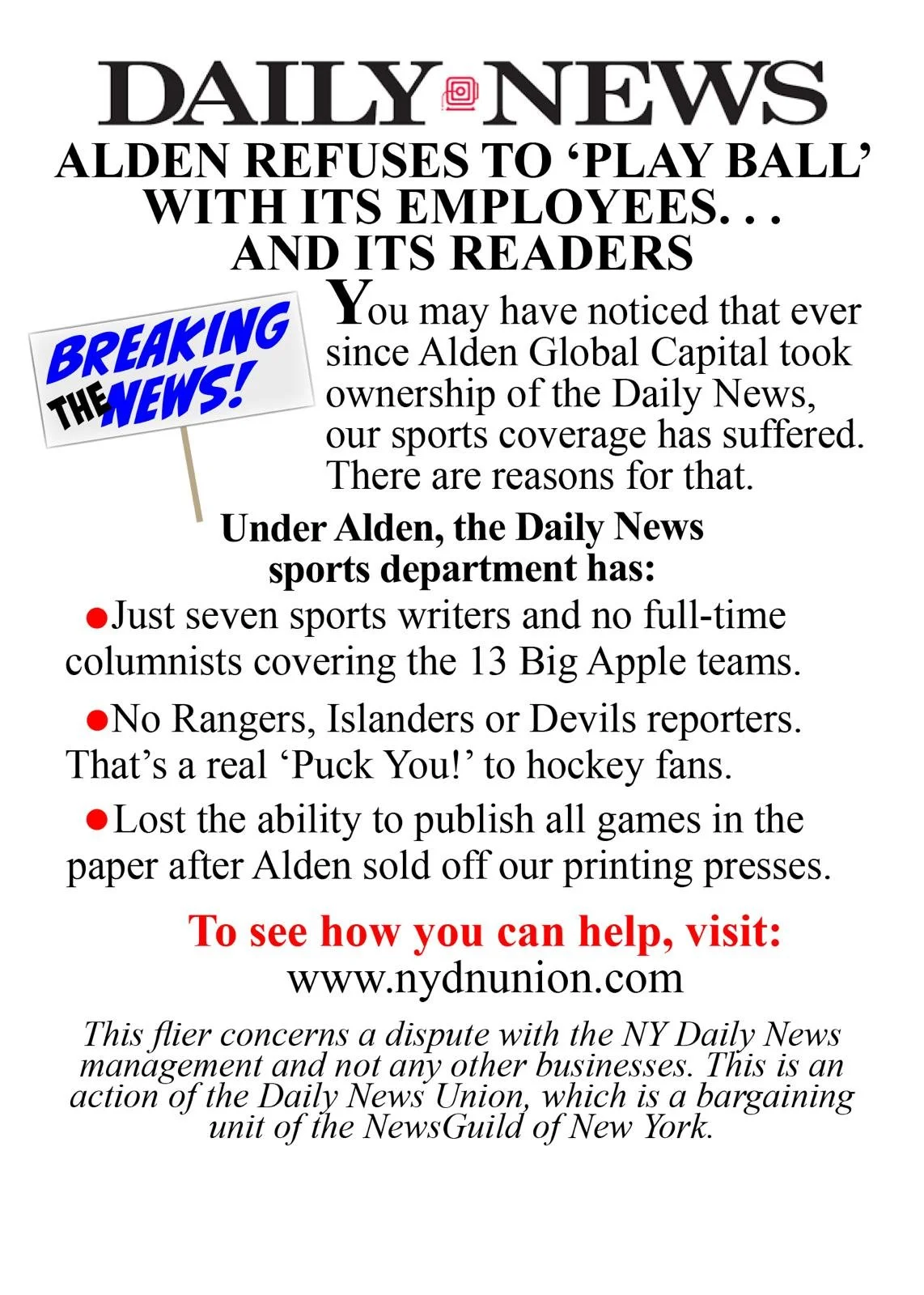Daily News Union members want Alden Global Capital to play ball at the bargaining table - so they spread awareness at a recent Yankees/Red Sox game about how Alden Global Capital has slashed sports staff since it acquired New York’s Hometown Paper. Members met with baseball fans, passed out flyers and even their own baseball cards.